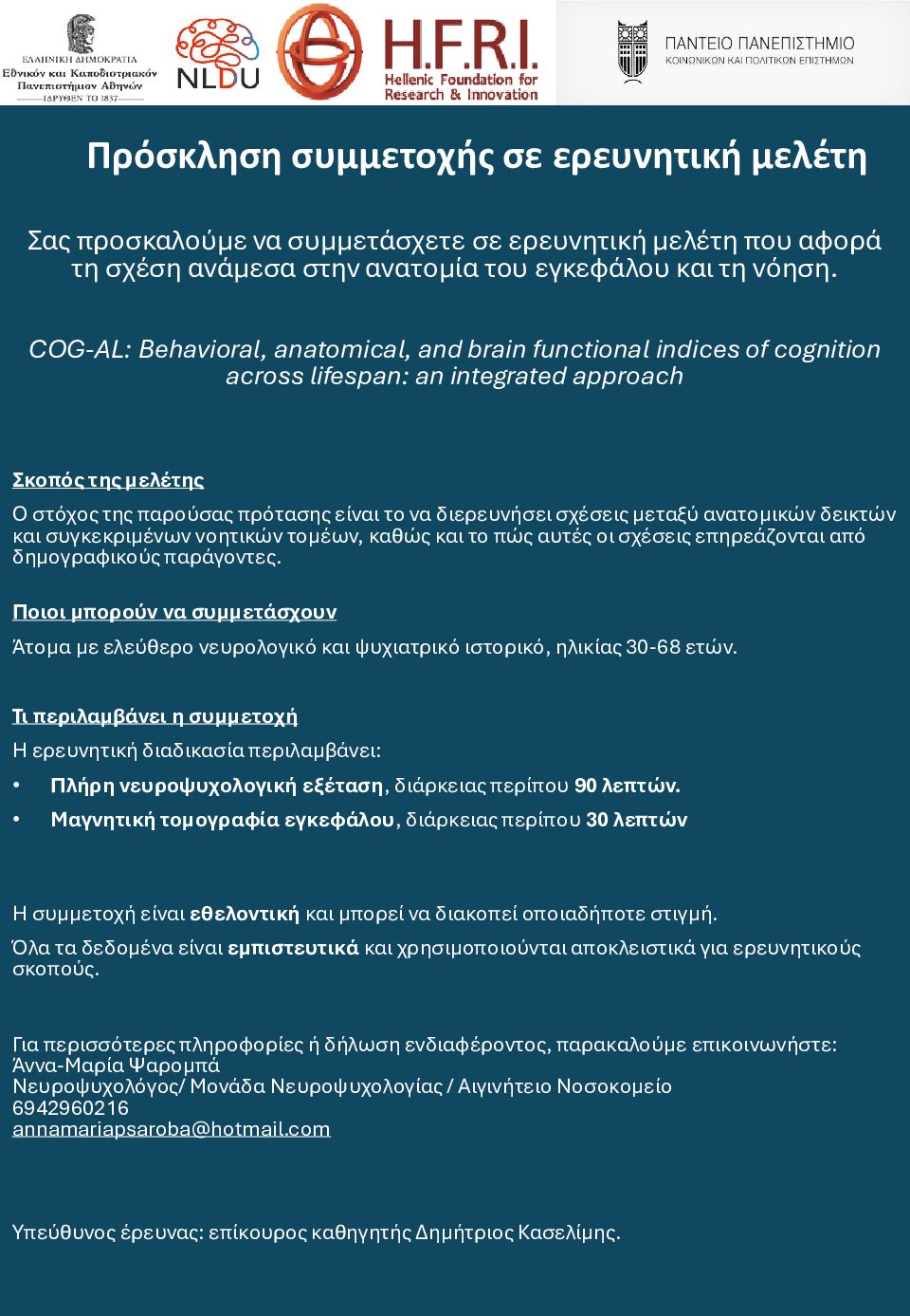 Σας προσκαλούμε να συμμετάσχετε σε ερευνητική μελέτη που αφορά τησχέση ανάμεσα στην ανατομία του εγκεφάλου και τη νόηση.